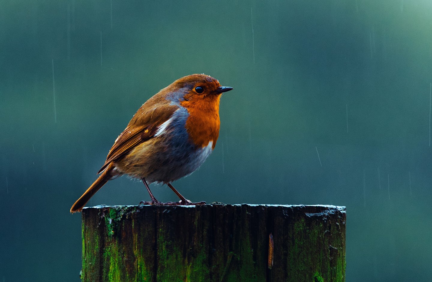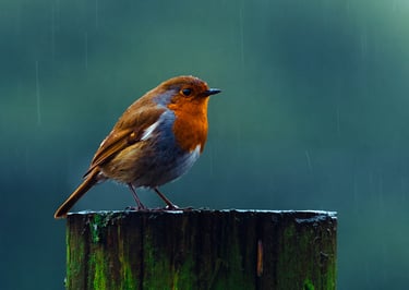 Robin Perched On A Wooden Post, Captured In The Gentle Rain