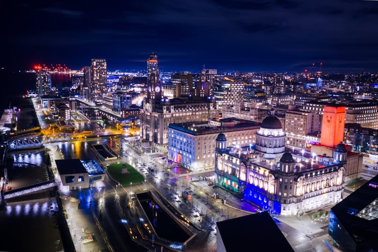 Aerial View Of Liverpool Pier Head At Night